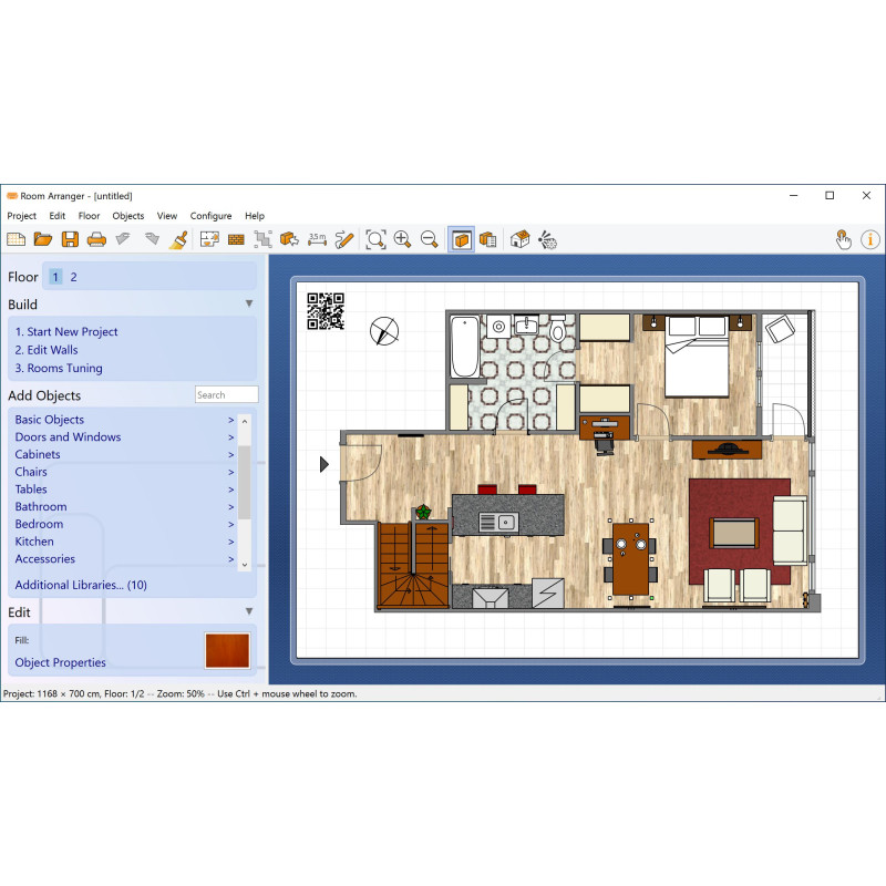 Room Arranger даёт возможность быстро нарисовать план комнаты или целого дома. Пользователь может задать точные размеры стен, обозначить двери и окна, подобрать материалы напольного покрытия. Это особенно полезно при ремонте или переезде, когда нужно заранее понять, как лучше использовать доступное пространство.Готовые библиотеки мебели и элементов декора